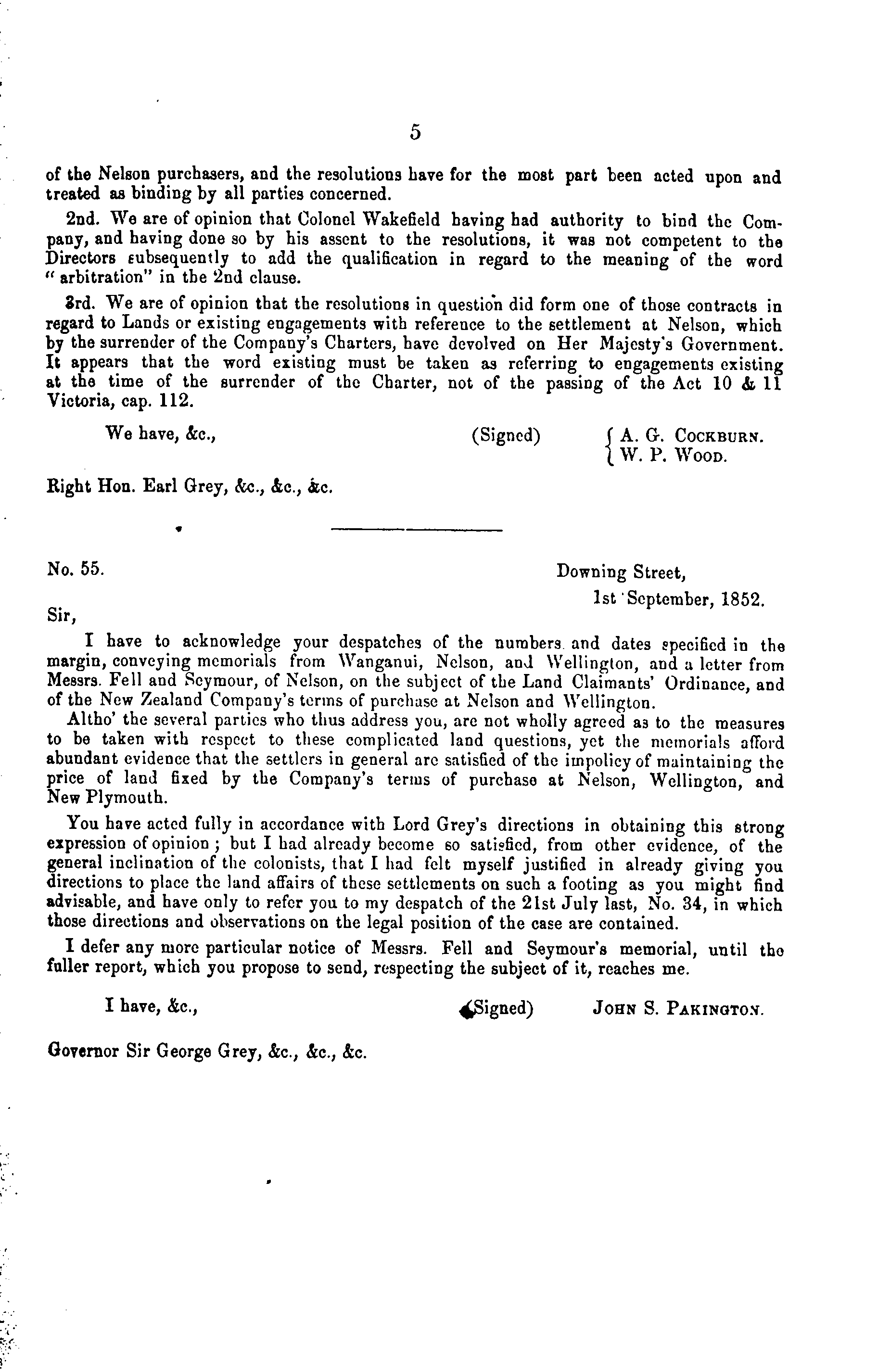 No. 55. Downing Street, Ist'September, 1852. Sir, I have to acknowledge your despatches of the numbers and dates specified in the margin, conveying memorials from Wanganui, Nelson, and Wellington, and a letter from Messrs. Fell and Seymour, of Nelson, on the subject of the Land Claimants' Ordinance, and of the New Zealand Company's terms of purchase at Nelson and Wellington. Altho' the several parties who thus address you, are not wholly agreed as to the measures to be taken with respect to these complicated land questions, yet the memorials afford abundant evidence that the settlers in general are satisfied of the impolicy of maintaining the price of land fixed by the Company's terms of purchase at Nelson, Wellington, 0 and New Plymouth. You have acted fully in accordance with Lord Grey's directions in obtaining this strong expression of opinion; but I had already become so satisfied, from other evidence, of the general inclination of the colonists, that I had felt myself justified in already giving you directions to place the land affairs of these settlements on such a footing as you might find advisable, and have only to refer you to my despatch of the 21st July last, No. 34, in which those directions and observations on the legal position of the case are contained. I defer any more particular notice of Messrs. Fell and Seymour's memorial, until the fuller report, which you propose to send, respecting the subject of it, reaches me. I have, &c., John S. Pakingto.v. Governor Sir George Grey, &c., &c., &c.