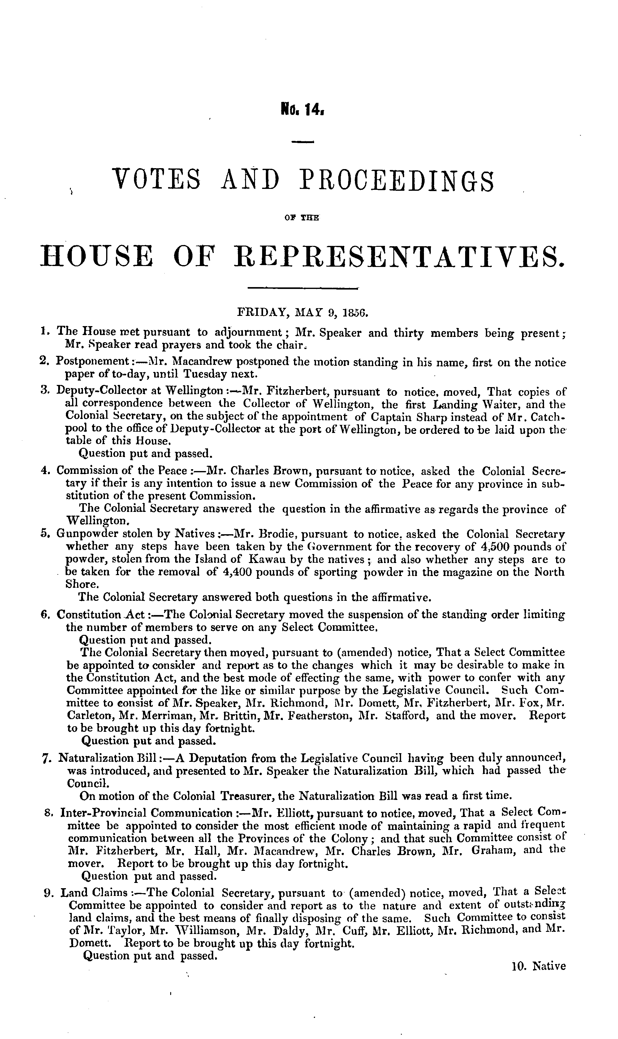FRIDAY, MAX" 9, 1856. 1. The House meet pursuant to adjournment; Mr. Speaker and thirty members being present; Mr. Speaker read prayers and took the chair, 2. Postponement:—Mr. Macandrew postponed the motion standing in his name, first on the notice paper of to-day, until Tuesday next. 3. Deputy-Collector at Wellington ••—Mr. Fitzherbert, pursuant to notice, moved, That copies of all correspondence between the Collector of Wellington, the first Landing Waiter, and the Colonial Secretary, on the subject of the appointment of Captain Sharp instead of Mr. Catchpool to the office of Deputy-Collector at the port of Wellington, be ordered to l>e laid upon the table of this House. Question put and passed. 4. Commission of the Peace : —Mr. Charles Brown, pursuant to notice, asked the Colonial Secretary if their is any intention to issue a new Commission of the Peace for any province in substitution of the present Commission. The Colonial Secretary answered the question in the affirmative as regards the province of Wellington. 5. Gunpowder stolen by Natives;— Mr. Brodie, pursuant to notice, asked the Colonial Secretary whether any steps have been taken by the Government for the recovery of 4,500 pounds of powder, stolen from the Island of Kawau by the natives ; and also whether any steps are to be taken for the removal of 4,400 pounds of sporting powder in the magazine on the North Shore. The Colonial Secretary answered both questions in the affirmative. 6. Constitution Act:—The Colonial Secretary moved the suspension of the standing order limiting the number of members to serve on any Select Committee. Question put and passed. The Colonial Secretary then moved, pursuant to (amended) notice, That a Select Committee be appointed to conskler and report as to the changes which it may be desirable to make in the Constitution Act, and the best mode of effecting the same, with power to confer with any Committee appointed for the like or similar purpose by the Legislative Council. Such Committee to consist of Mr. Speaker, Mr. Richmond, Mr. Domett, Mr, Fitzherbert, Mr. Fox, Mr. Carleton, Mr. Merriman, Mr. Brittin, Mr. Featherston, Mr. Stafford, and the mover. Report to be brought up this day fortnight. Question put and passed. 7. Naturalization Bill:—A Deputation from the Legislative Council having been duly announced, was introduced, and presented to Mr. Speaker the Naturalization Bill, which had passed the Council. On motion of the Colonial Treasurer, the Naturalization Bill was read a first time. 8. Inter-Provincial Communication :—Mr. Elliott, pursuant to notice, moved, That a Select Committee be appointed to consider the most efficient mode of maintaining a rapid and frequent communication between all the Provinces of the Colony ; and that such Committee consist ot Mr. Fitzherbert, Mr. Hall, Mr. Macandrew, Mr. Charles Brown, Mr. Graham, and the mover. Report to be brought up this day fortnight. Question put and passed. 9. Land Claims ;—The Colonial Secretary, pursuant to (amended) notice, moved, That a Select Committee be appointed to consider and report as to the nature and extent of outstanding land claims, and the best means of finally disposing of the same. Such Committee to consist of Mr. Taylor, Mr. Williamson, Mr. Daldy, Mr. Cuff, Mr. Elliott, Mr. Richmond, and Mr. Domett. Report to be brought up this day fortnight. Question put and passed. 10. Native