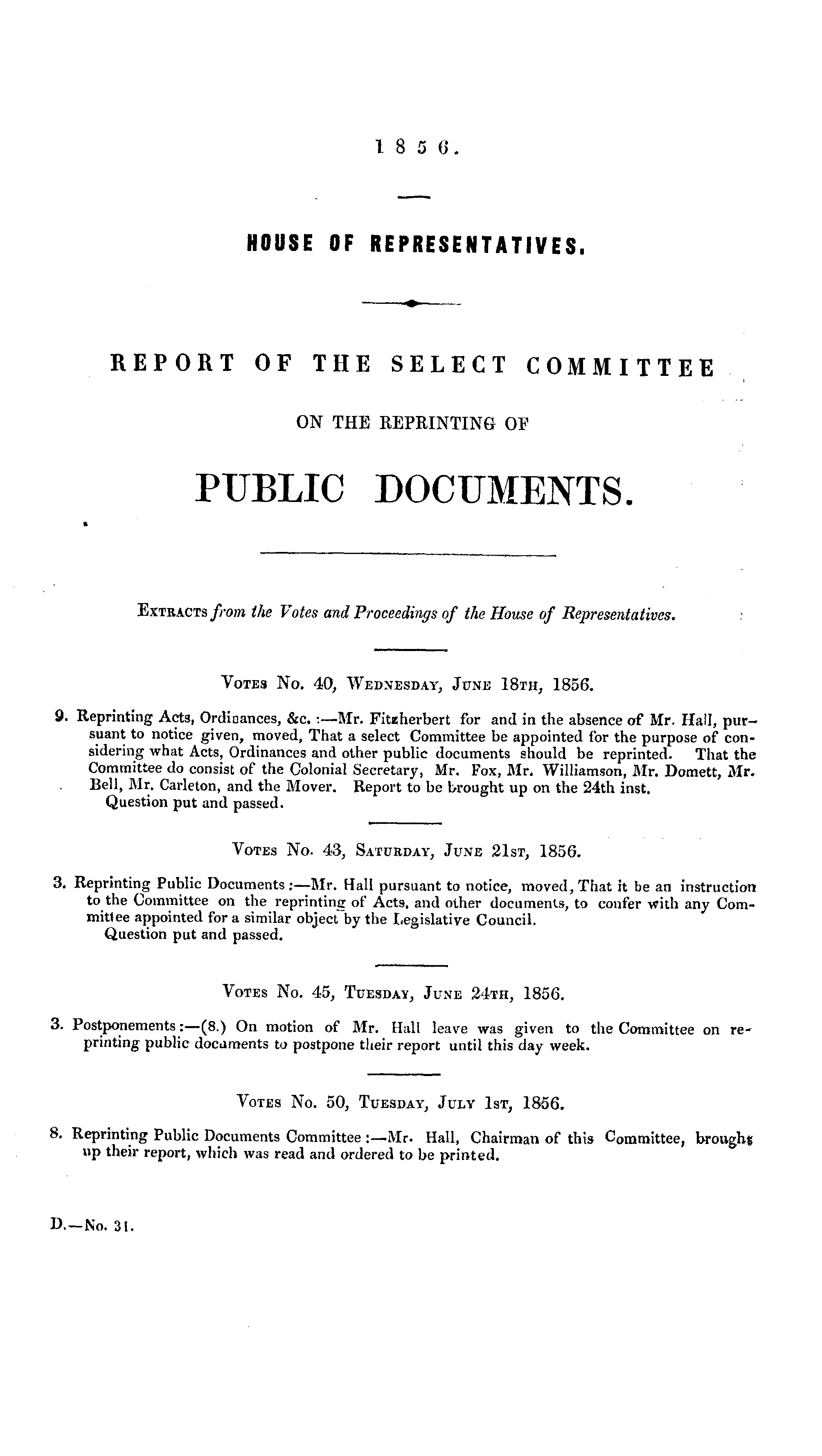 Votes No. 50, Tuesday, July Ist, 1856. S. Reprinting Public Documents Committee :—Mr. Hall, Chairman of this Committee, brought up their report, which was read and ordered to be printed.