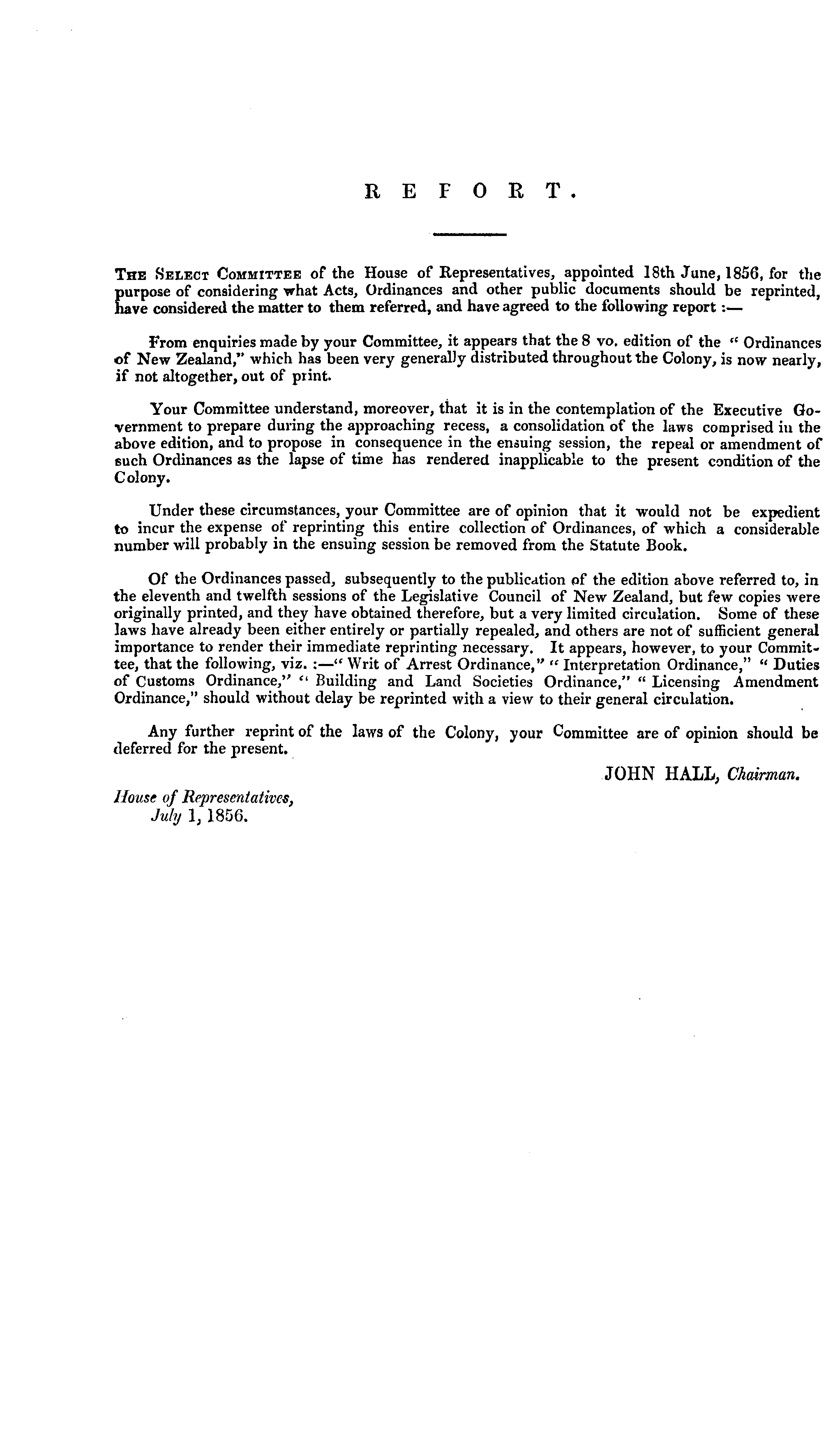 The Select Committee of the House of Representatives, appointed 18th June, 1856, for the purpose of considering what Acts, Ordinances and other public documents should be reprinted, have considered the matter to them referred, and have agreed to the following report :— From enquiries made by your Committee, it appears that the 8 vo. edition of the " Ordinances of New Zealand," which has been very generally distributed throughout the Colony, is now nearly, if not altogether, out of print. Your Committee understand, moreover, that it is in the contemplation of the Executive Government to prepare during the approaching recess, a consolidation of the laws comprised in the above edition, and to propose in consequence in the ensuing session, the repeal or amendment of such Ordinances as the lapse of time has rendered inapplicable to the present condition of the C olony. Under these circumstances, your Committee are of opinion that it would not be expedient to incur the expense of reprinting this entire collection of Ordinances, of which a considerable number will probably in the ensuing session be removed from the Statute Book. Of the Ordinances passed, subsequently to the publication of the edition above referred to, in the eleventh and twelfth sessions of the Legislative Council of New Zealand, but few copies were originally printed, and they have obtained therefore, but a very limited circulation. Some of these laws have already been either entirely or partially repealed, and others are not of sufficient general importance to render their immediate reprinting necessary. It appears, however, to your Committee, that the following, viz. :—" Writ of Arrest Ordinance," " Interpretation Ordinance," " Duties of Customs Ordinance," " Building and Land Societies Ordinance," " Licensing Amendment Ordinance," should without delay be reprinted with a view to their general circulation. Any further reprint of the laws of the Colony, your Committee are of opinion should be deferred for the present. JOHN IIALL; Chairman. House of Representatives, July 1856.