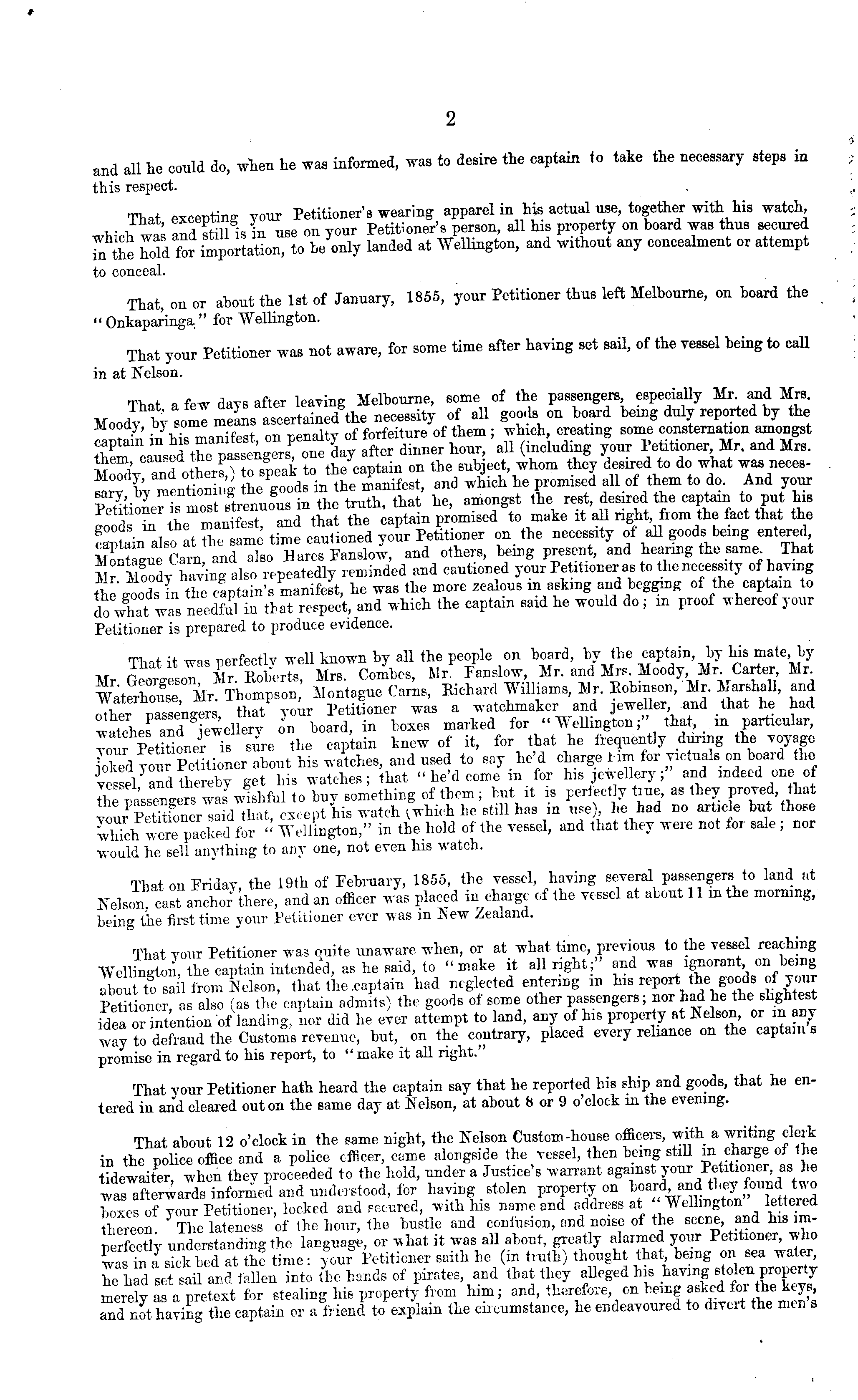 and all he could do, when he was informed, was to desire the captain to take the necessary steps in this respect. That excepting your Petitioner's wearing apparel in his actual use, together with his watch, t,- iT „= 3 ,Hllis in use on your Petitioner's person, all his property on board was thus secured She hold for importation, to be only landed at Wellington, and without any concealment or attempt to conceal. That, on or about the Ist of January, 1855, your Petitioner thus left Melbourne, on board the " Onkaparinga." for Wellington. That your Petitioner was not aware, for some time after having set sail, of the vessel being to call in at Nelson. mi j. „ w . lavß a f ter leaving Melbourne, some of the passengers, especially Mr. and Mrs. Moody by some means ascertained the necessity of all goods on board being duly reported by the juooa}, "J . ~f forfeiture of them ; which, creating some consternation amongst hour, alt (,»U» S Mr. ,»d M ra . them, caused t p g , capta in on the subject, whom they desired to do what was necesMoody, and others,) manifest, and which he promised all of them to do. And your Petitioners most strenuous in the truth, that he, amongst the rest, desired the captain to put his goods in the manifest, and that the captain promised to make it aU right from the fact that the Stain also at the same time cautioned your Petitioner on the necessity of all goods being entered Mont ague C a rn, and also Hares Fanslow, and others, being present, and hearing the same That Mr Moody having also repeatedly reminded and cautioned your Petitioner as to the necessity of having the goods in the captain's manifest, he was the more zealous in asking and begging of the captain to do what wTs needful in that respect, and which the captain said he would do; m proof whereof your Petitioner is prepared to produce evidence. TW It wis perfectly well known by all the people on board, by the captain, by his mate by MrS™ E SoS-rt. Mrs. C.i„, Sir' r«»l» T . Mr. .nd Mr. Moody, Mr. •, Mr. Waterhouse, Mr. Thompson, Montague Cams, Richard Williams, Mr. Robinson, Mr. Marshall, and other passengers that your Petitioner was a watchmaker and jeweller, and that he had batches and jewellery on board, in boxes marked for '' Wellington;" that, m particular, your Petitioner is sure the captain knew of it, for that he frequently during the voyage foked your Petitioner about his watches, and used to say he'd charge Mm for victuals on board the vessel and therebv get his watches; that » he'd come m for his jewellery; and indeed one of was wishful to buy something of them ; but it is perfectly true, as they proved that your Petitioner said that, « ~ept his watch ; which he still has m use) he had no article but those which were packed for " Wellington," in the hold of the vessel, and that they were not for sale ; nor would he sell anything to any one, not even his watch. That on Friday the 19th of February, 1855, the vessel, having several passengers to land at Nelson cast anchor there, and an officer was placed in charge of the vessel at about 11 m the morning, being the first time your Petitioner ever was m New Zealand. That your Petitioner was quite unaware when, or at what time, previous to the vessel reaching Wellington, the captain intended, as he said, to "make it all right;" and was ignorant on being about to sail from Nelson, that the .captain had neglected entering m his report the goods of your Petitioner, as also (as the captain admits) the goods of some other passengers; nor had lie the slightest idea or intention of landing nor did he ever attempt to land, any of lus property at Iselson, or in anj way to defraud the Customs revenue, but, on the contrary, placed every reliance on the captain s promise in regard to his report, to " make it all right." That vour Petitioner hath heard the captain say that he reported his ship and goods, that he entered in and cleared out on the same day at Kelson, at about 8 or 9 o'clock in the evening. That about 12 o'clock in the same night, the Nelson Custom-house officers, with a writing clerk in the police office and a police officer, came alongside the vessel, then being still m charge oj the tldewaiter, when thev proceeded to the hold, under a Justice's warrant against your Petitioner, as he was afterwards informed and understood, for having stolen property on board and they found two boxes of your Petitioner, locked and secured, with his name and address at Wellington letteitd thereon The lateness of the hour, the hustle and confusion, and noise of the scene, and his imperfectly understanding the language, or what it was all about, greatly alarmed your Petitioner, <nho was in a sick bed at the time : a our Petitioner saith he (in truth) thought that being on sea water, he had set sail and fallen into the hands of pirates, and that they alleged his navmg stolen property merely as a pretext for stealing his property from him ; and, therefore, on being asked for the keys and not having the captain or a friend to explain the circumstance, he endeavoured to divert the men