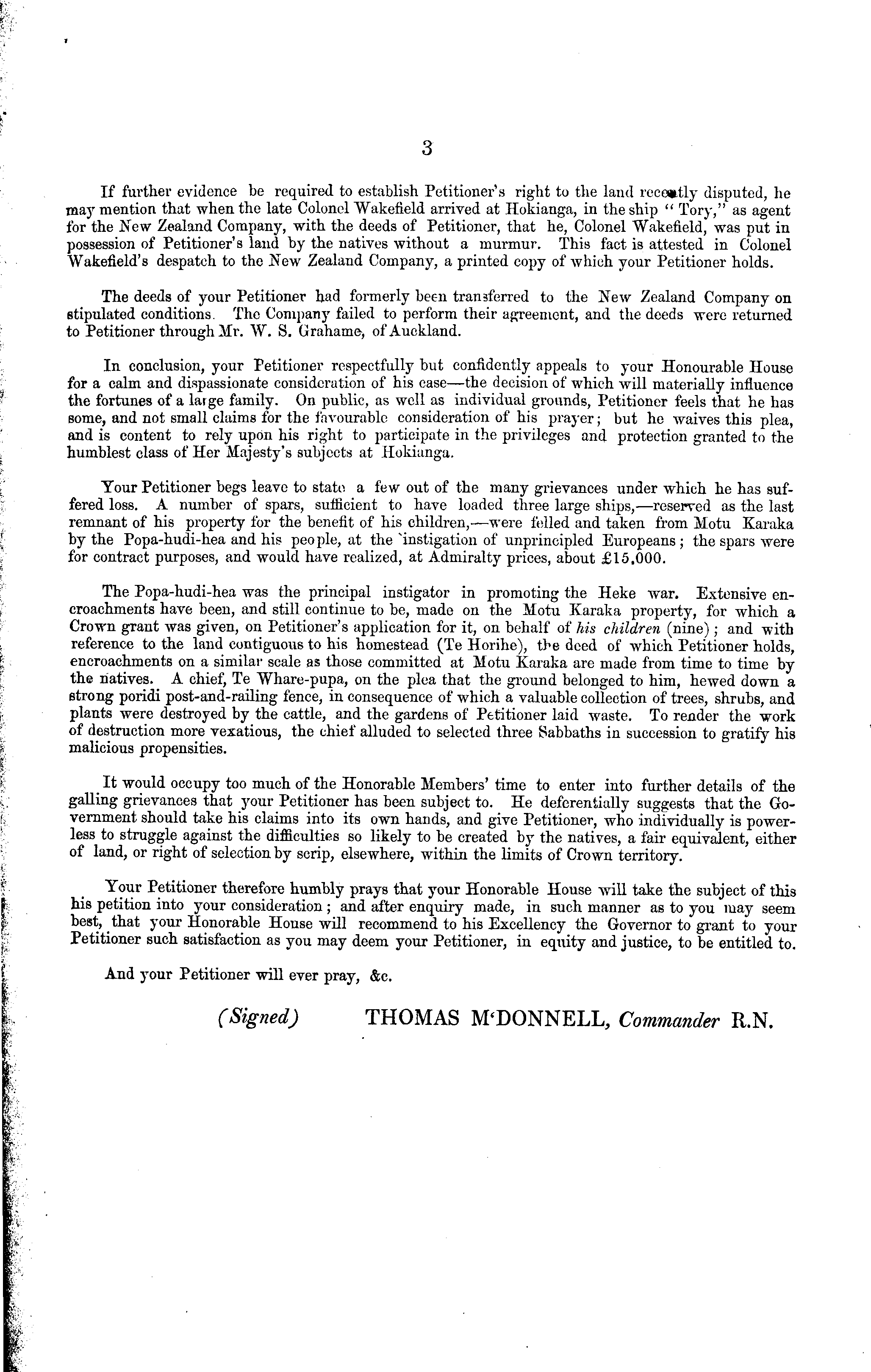If further evidence be required to establish Petitioner's right to the land recently disputed, he may mention that when the late Colonel Wakefield arrived at Hokianga, in the ship " Tory," as agent for the Xew Zealand Company, with the deeds of Petitioner, that he, Colonel Wakefield, was put in possession of Petitioner's land by the natives without a murmur. This fact is attested in Colonel Wakefield's despatch to the New Zealand Company, a printed copy of which your Petitioner holds. The deeds of your Petitioner had formerly been transferred to the New Zealand Company on stipulated conditions The Company failed to perform their agreement, and the deeds were returned to Petitioner through Mr. W. S. (irahame, of Auckland. In conclusion, your Petitioner respectfully but confidently appeals to your Honourable House for a calm and dispassionate consideration of his ease—the decision of which will materially influence the fortunes of a large family. On public, as well as individual grounds, Petitioner feels that he has some, and not small claims for the favourable consideration of his prayer; but he waives this plea, and is content to rely upon his right to participate in the privileges and protection granted to the humblest class of Her Majesty's subjects at Hokianga. Your Petitioner begs leave to state a few out of the many grievances under which he has suffered loss. A number of spars, sufficient to have loaded three large ships, —reserved as the last remnant of his property for the benefit of his children, —were felled and taken from Motu Karaka by the Popa-hudi-hea and his people, at the "instigation of unprincipled Europeans ; the spars were for contract purposes, and would have realized, at Admiralty prices, about £15,000. The Popa-hudi-hea was the principal instigator in promoting the Heke war. Extensive encroachments have been, and still continue to be, made on the Motu Karaka property, for which a Crown grant was given, on Petitioner's application for it, on behalf of his children (nine); and with reference to the land contiguous to his homestead (Te Horihe), the deed of which Petitioner holds, encroachments on a similar scale as those committed at Motu Karaka are made from time to time by the natives. A chief, Te Whare-pupa, on the plea that the ground belonged to him, hewed down a strong poridi post-and-railing fence, inconsequence of which a valuable collection of trees, shrubs, and plants were destroyed by the cattle, and the gardens of Petitioner laid waste. To render the work of destruction more vexatious, the chief alluded to selected three Sabbaths in succession to gratify his malicious propensities. It would occupy too much of the Honorable Members' time to enter into further details of the galling grievances that your Petitioner has been subject to. He deferentially suggests that the Government should take his claims into its own hands, and give Petitioner, who individually is powerless to struggle against the difficulties so likely to be created by the natives, a fair equivalent, either of land, or right of selection by scrip, elsewhere, within the limits of Crown territory. Your Petitioner therefore humbly prays that your Honorable House will take the subject of this his petition into your consideration ; and after enquiry made, in such manner as to you may seem best, that your Honorable House will recommend to his Excellency the Governor to grant to your Petitioner such satisfaction as you may deem your Petitioner, in equity and justice, to be entitled to. And your Petitioner will ever pray, &c. (Signed) THOMAS iM'DONNELL, Commander R.N.