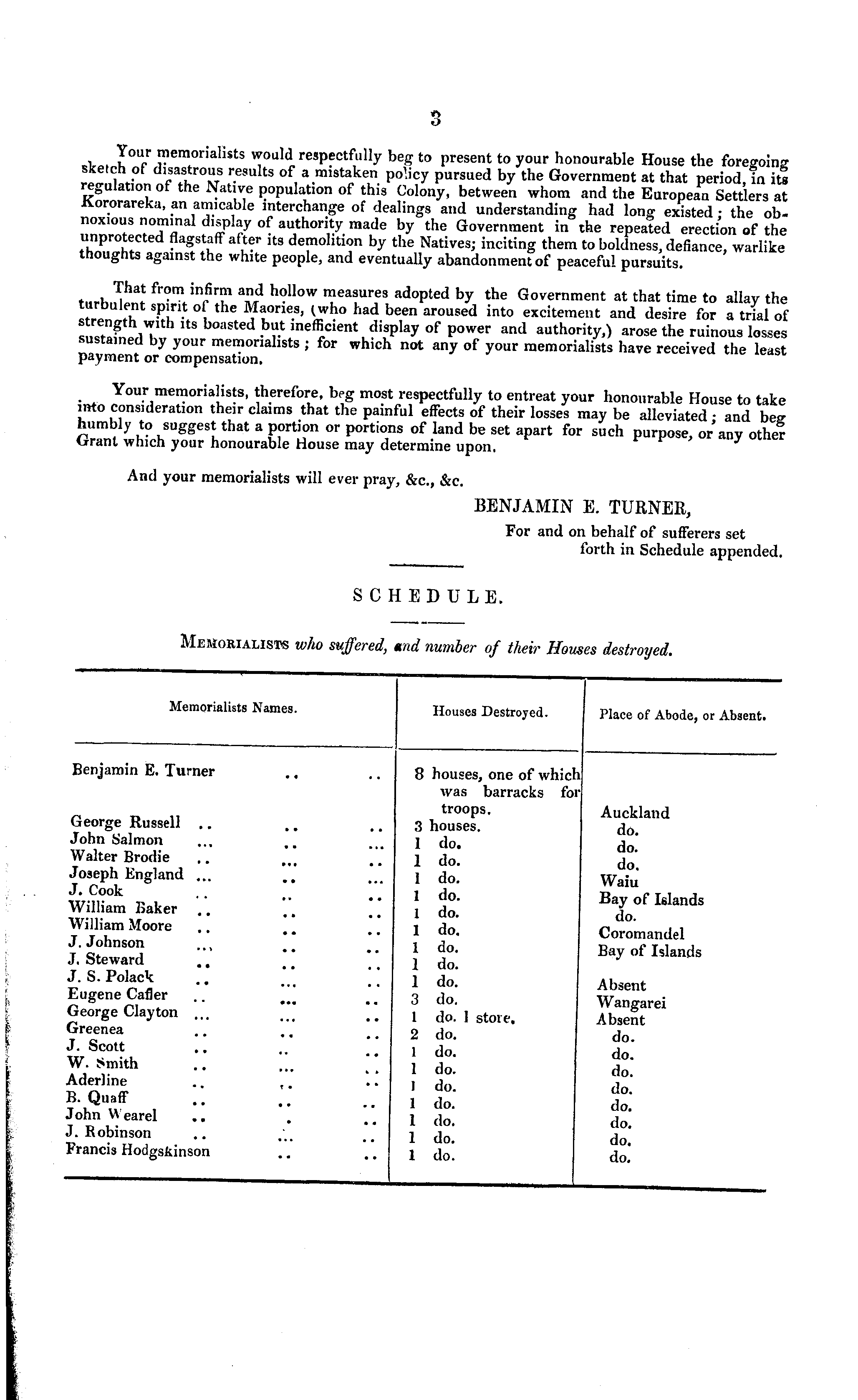 , , ou / " lotr ! onalists would respectfully beg to present to your honourable House the foregoing ketch of disastrous results of a mistaken policy pursued by the Government at that period, in its egu ation ot the Native population of this Colony, between whom and the European Settlers at Kororareka, an amicable interchange of dealings and understanding had long existed • the obnoxious nominal display of authority made by the Government in the repeated erection of the unprotected flagstaff after its demolition by the Natives; inciting them to boldness, defiance, warlike thoughts against the white people, and eventually abandonment of peaceful pursuits. t „ r , fr< ? m infirm and hollow measures adopted by the Government at that time to allay the bulent spirit of the Maories, (who had been aroused into excitement and desire for a trial of strength with its boasted but inefficient display of power and authority,) arose the ruinous losses stained by your memorialists ; for which not any of your memorialists have received the least payment or compensation. Your memorialists, therefore, beg most respectfully to entreat your honourable House to take into consideration their claims that the painful effects of their losses may be alleviated • and beehumbly to suggest that a portion or portions of land be set apart for such purpose, or any other Grant which your honourable House may determine upon. And your memorialists will ever pray, &c., &c. BENJAMIN E. TURNER, For and on behalf of sufferers set forth in Schedule appended.