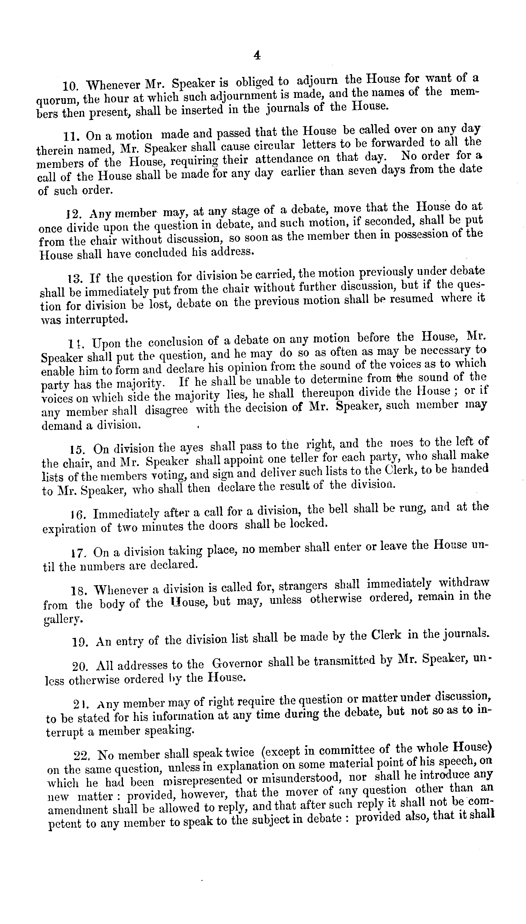 10. Whenever Mr. Speaker is obliged to adjourn the House for want ot a quorum' the hour at which such adjournment is made, and the names of the members then present, shall be inserted in the journals of the House. 11. On a motion made and passed that the House be called over on any day therein named, Mr. Speaker shall cause circular letters to be forwarded to all the members of the House, requiring their attendance on that day. Iso older for a call of the House shall be made for any day earlier than seven days from the date of such order. J2. Any member may, at any stage of a debate, move that the at once divide upon the question in debate, and such motion, if seconded, shall be put from the chair without discussion, so soon as the member then m possession of the House shall have concluded his address. 13. If the question for division be carried, the motion previously under debate shall be immediately put from the chair without further discussion, but if the question for division be lost, debate on the previous motion shall be resumed where it was interrupted. I{. Upon the conclusion of a debate on any motion before the House, Mr. Speaker shall put the question, and he may do so as often as may be necessary to enable him to form and declare his opinion from the sound of the voices as to w c party has the majority. If he shall be unable to determine from the sound of the voices on which side the majority lies, he shall thereupon divide the House ; or if any member shall disagree with the decision of Mr. Speaker, such member may demand a division. 15 On division the ayes shall pass to the right, and the noes to the left of the chair, and Mr. Speaker shall appoint one teller for each party, who, shall make lists of the members voting, and sign and deliver such lists to the Clerk, to be hande to Mr. Speaker, who shall then declare the result of the division. 16. Immediately after a call for a division, the bell shall be rung, and at the expiration of two minutes the doors shall be locked. 17. On a division taking place, no member shall enter or leave the House until the numbers are declared. 18. Whenever a division is called for, strangers shall immediately withdraw from the body of the House, but may, unless otherwise ordered, remain in the gallery. 19. An entry of the division list shall be made by the Clerk in the journals. 20. All addresses to the Governor shall be transmitted by Mr. Speaker, unless otherwise ordered by the House. 21. Any member may of right require the question or matter under discussion, to be stated for his information at any time during the debate, but not so as oin terrupt a member speaking. 22. No member shall speak twice (except in committee of the whole House) on the same question, unless in explanation on some material point of his s P eech ' « which he had been misrepresented or misunderstood, nor shall he ' * new matter: provided, however, that the mover of any question other than an amendment shall be allowed to reply, and that after such reply it shall not be petent to any member to speak to the subject in debate : provided also, that it shall