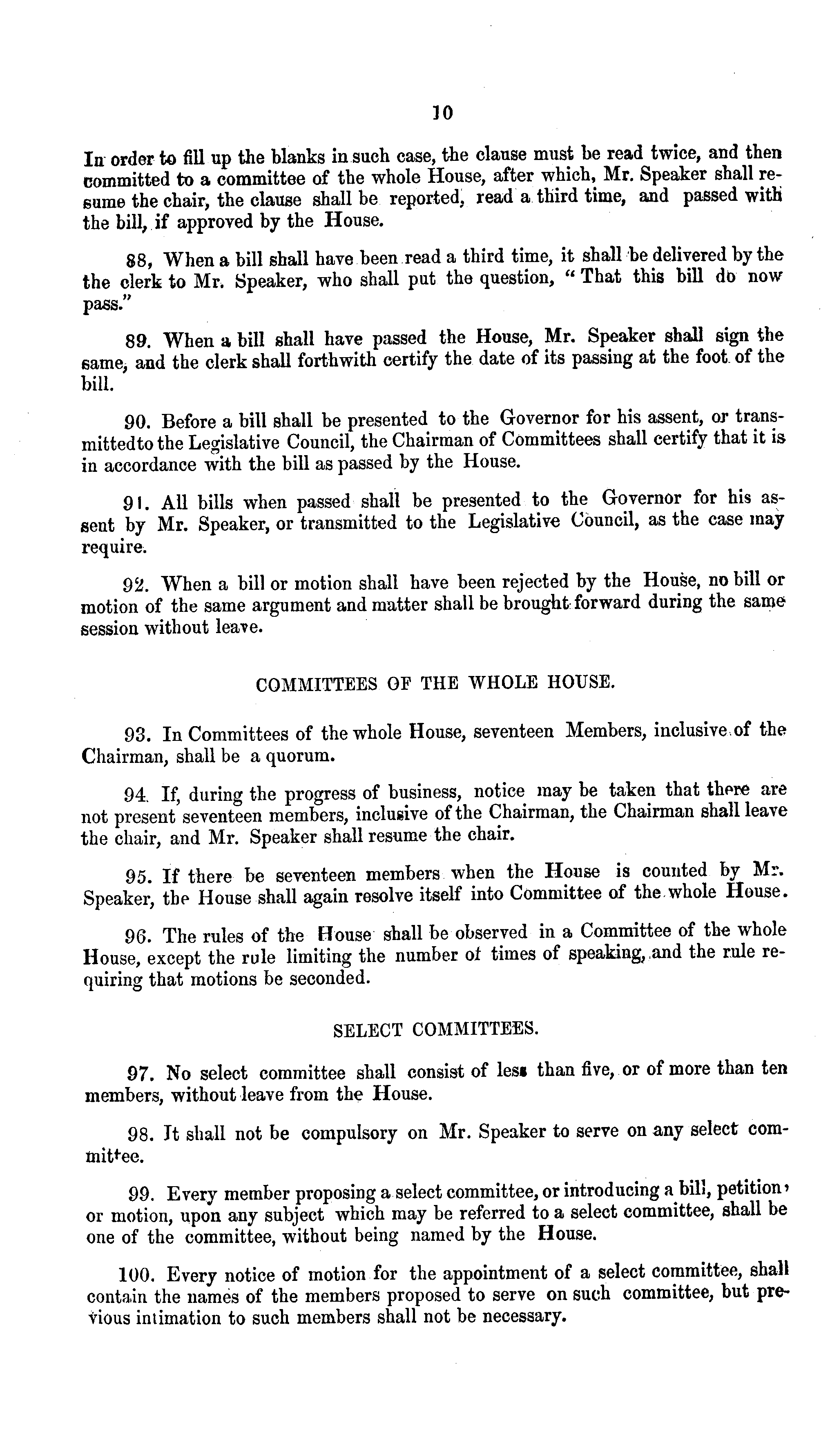In order to fill up the blanks in such case, the clause must be read twice, and then committed to a committee of the whole House, after which, Mr. Speaker shall resume the chair, the clause shall be reported, read a third time, and passed with the bill, if approved by the House. 88. When a bill shall have been read a third time, it shall be delivered by the the clerk to Mr. Speaker, who shall put the question, " That this bill do now pass." 89. When a bill shall have passed the House, Mr. Speaker shall sign the same, and the clerk shall forthwith certify the date of its passing at the foot of the bill. 90. Before a bill shall be presented to the Governor for his assent, or transmittedto the Legislative Council, the Chairman of Committees shall certify that it is in accordance with the bill as passed by the House. 91. All bills when passed shall be presented to the Governor for his assent by Mr. Speaker, or transmitted to the Legislative Council, as the case may require. 92. When a bill or motion shall have been rejected by the House, no bill or motion of the same argument and matter shall be brought forward during the same session without leave. COMMITTEES OF THE WHOLE HOUSE. 93. In Committees of the whole House, seventeen Members, inclusive of the Chairman, shall be a quorum. 94. If, during the progress of business, notice may be taken that there are not present seventeen members, inclusive of the Chairman, the Chairman shall leave the chair, and Mr. Speaker shall resume the chair. 95. If there be seventeen members when the House is counted by Mr. Speaker, the House shall again resolve itself into Committee of the whole House. 96. The rules of the House shall be observed in a Committee of the whole House, except the rule limiting the number of times of speaking, and the rule requiring that motions be seconded. SELECT COMMITTEES. 97. No select committee shall consist of less than five, or of more than ten members, without leave from the House. 98. It shall not be compulsory on Mr. Speaker to serve on any select committee. 99. Every member proposing a select committee, or introducing a bill, petition* or motion, upon any subject which may be referred to a select committee, shall be one of the committee, without being named by the House. 100. Every notice of motion for the appointment of a select committee, shall contain the names of the members proposed to serve on such committee, but previous intimation to such members shall not be necessary.
