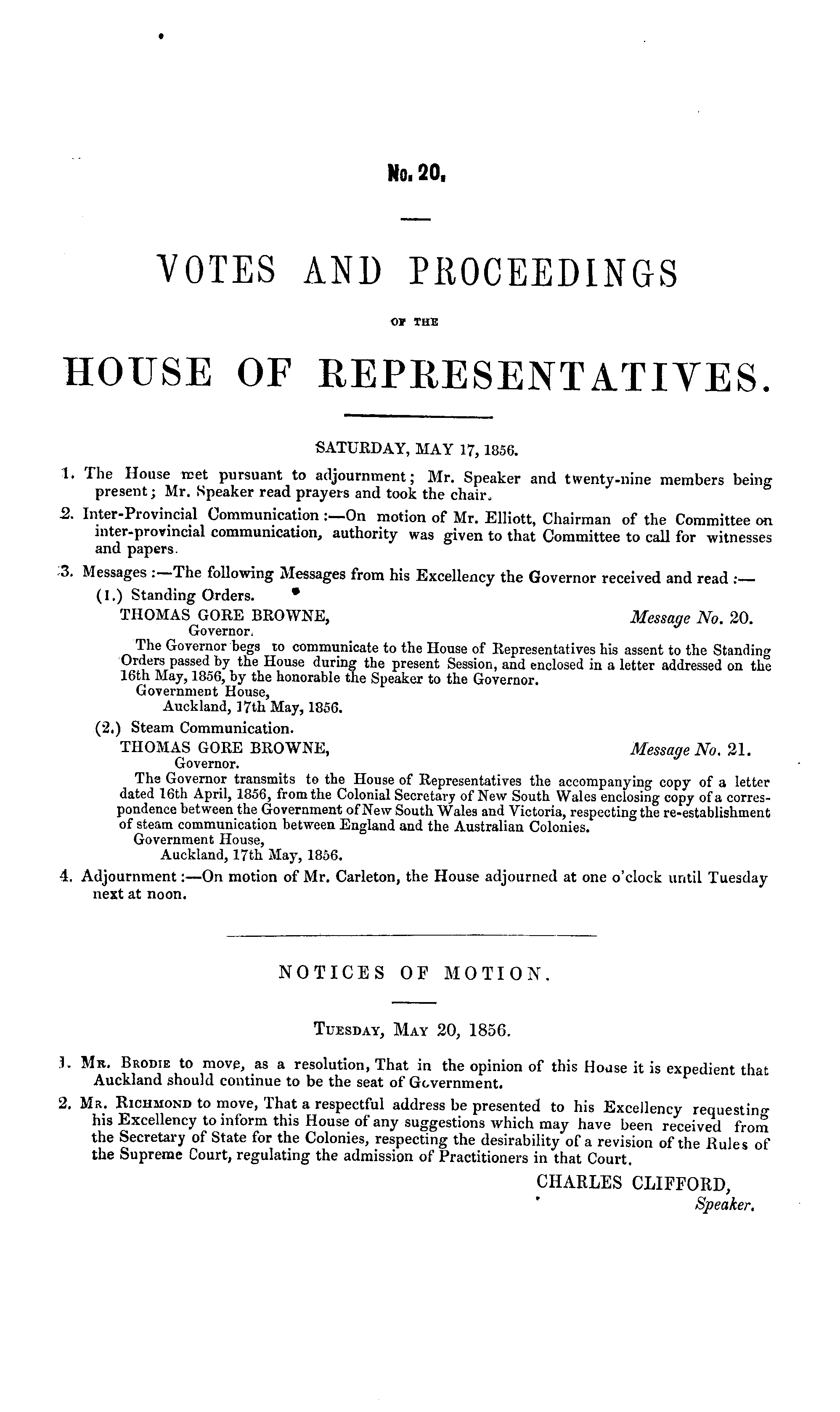 SATURDAY, MAY 17,1856. 1. The House rcet pursuant to adjournment; Mr. Speaker and twenty-nine members being present; Mr. Speaker read prayers and took the chair, 2. Inter-Provincial Communication On motion of Mr. Elliott, Chairman of the Committee on inter-provincial communication, authority was given to that Committee to call for witnesses and papers. 3. Messages The following Messages from his Excellency the Governor received and read (I.) Standing Orders. * THOMAS GORE BROWNE, Message No. 20. Governor, The Governor begs to communicate to the House of Representatives his assent to the Standing Orders passed by the House during the present Session, and enclosed in a letter addressed on the 16th May, 1856, by the honorable the Speaker to the Governor. Government House, Auckland, 17th May, 1856. (2.) Steam Communication. THOMAS GORE BROWNE, Message No. 21. Governor. The Governor transmits to the House of Representatives the accompanying copy of a letter dated 16th April, 1856, from the Colonial Secretary of New South Wales enclosing copy of a correspondence between the Government of New South Wales and Victoria, respecting the re-establishment of steam communication between England and the Australian Colonies. Government House, Auckland, 17th May, 1856. 4. Adjournment:—On motion of Mr. Carleton, the House adjourned at one o'clock until Tuesday next at noon.