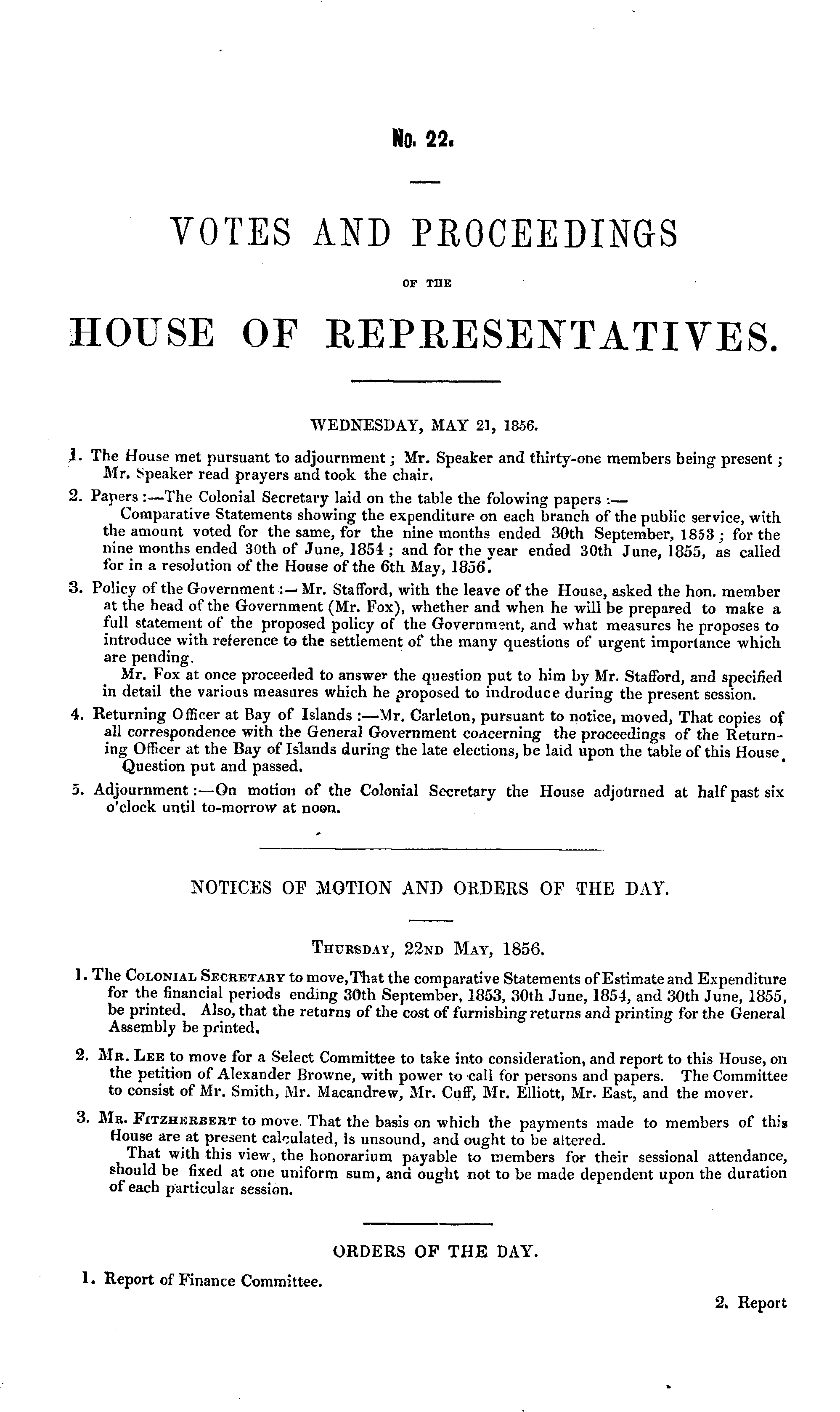 NOTICES OF MOTION AND ORDERS OF THE DAY. Thursday, 22nd May, 1856. ]. The Colonial Secretary to move, That the comparative Statements of Estimate and Expenditure for the financial periods ending 30th September, 1853, 30th June, 1854, and 30th June, 1855, be printed. Also, that the returns of the cost of furnishing returns and printing for the General Assembly be printed. 2. Mr. Lee to move for a Select Committee to take into consideration, and report to this House, on the petition of Alexander Browne, with power to call for persons and papers. The Committee to consist of Mr. Smith, Mr. Macandrew, Mr. Cuff, Mr. Elliott, Mr. East, and the mover. 3. Me. Fitzhhrbert to move. That the basis on which the payments made to members of this House are at present calculated, is unsound, and ought to be altered. That with this view, the honorarium payable to members for their sessional attendance, should be fixed at one uniform sum, and ought not to be made dependent upon the duration of each particular session.