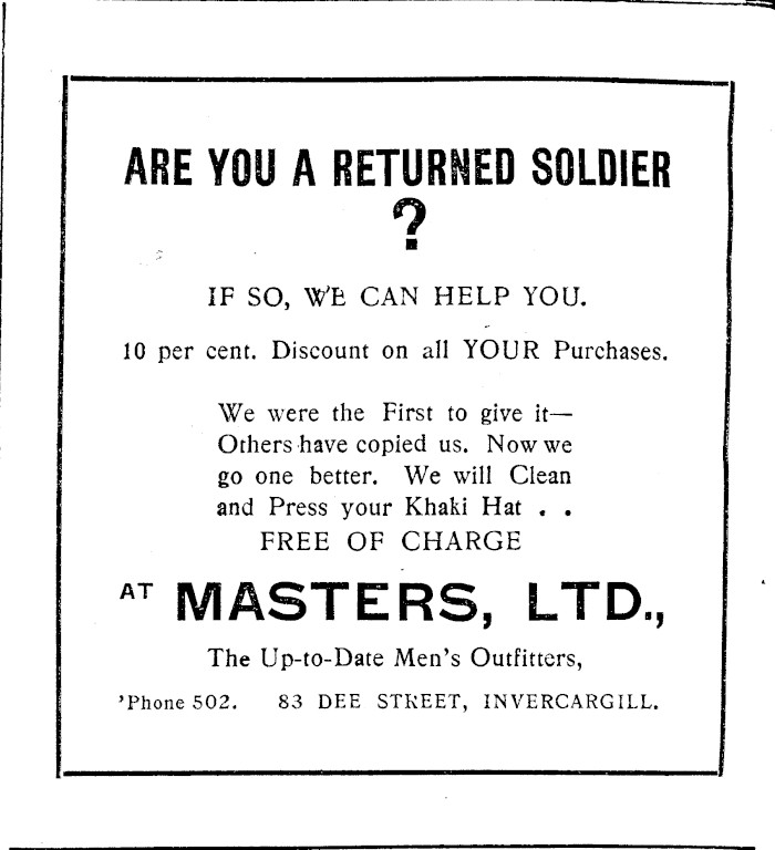 ARE YOU A RETURNED SOLDIER 9 ■ IF SO, WE CAN HELP YOU. 10 per cent. Discount on all YOUR Purchases. We were the First to give it— Others have copied us. Nowwe go one better. We will Clean and Press your Khaki Hat . . FREE OF CHARGE flT MASTERS, LTD., The Up-to-Date Men's Outfitters, 'Phone 502. 83 DEE STREET, INVERCARGILL.